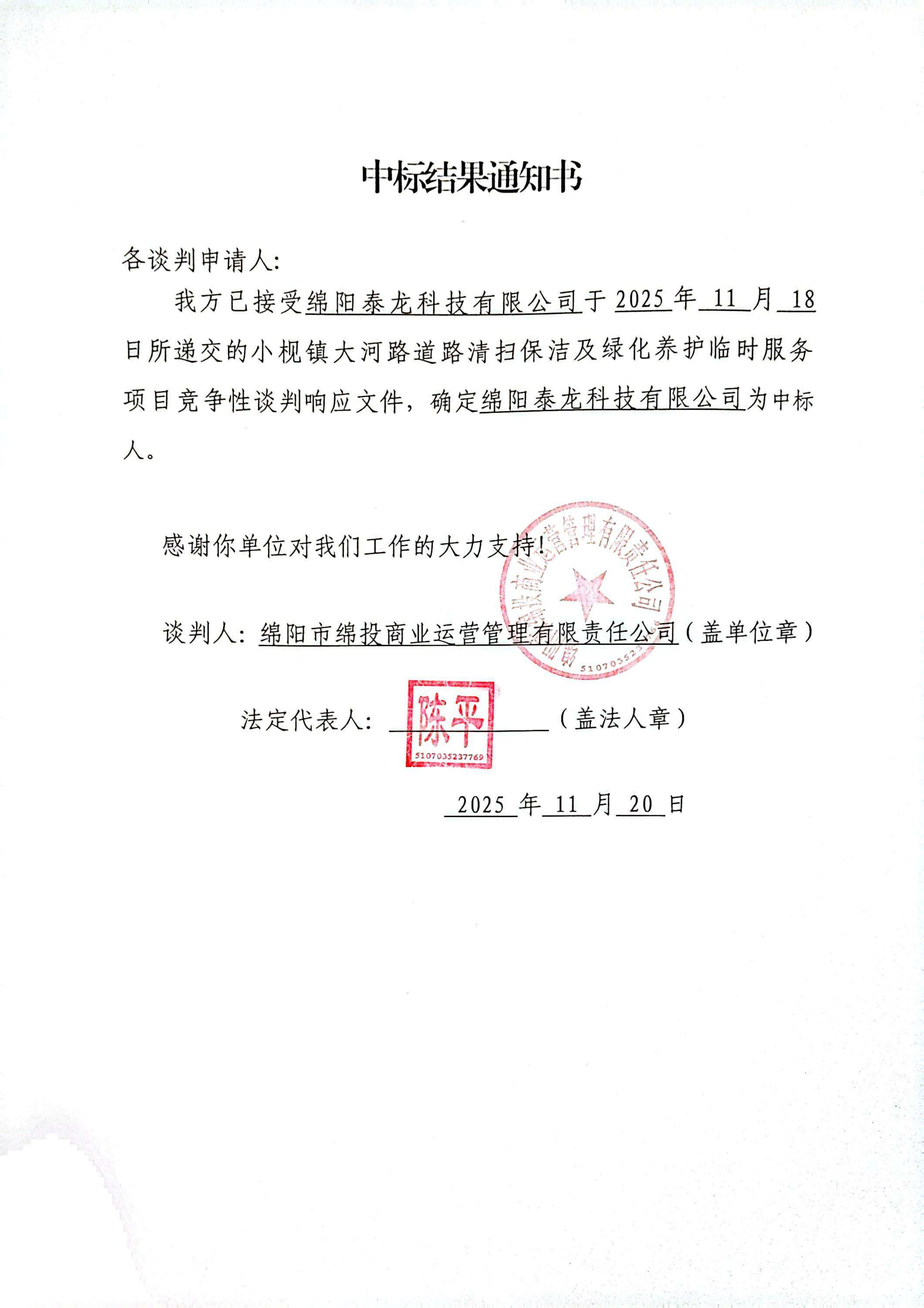 我方已接受綿陽泰龍科技有限公司于2025年 11 月 18 日所遞交的小枧鎮(zhèn)大河路道路清掃保潔及綠化養(yǎng)護(hù)臨時服務(wù)項目競爭性談判響應(yīng)文件,確定綿陽泰龍科技有限公司為中標(biāo)人。