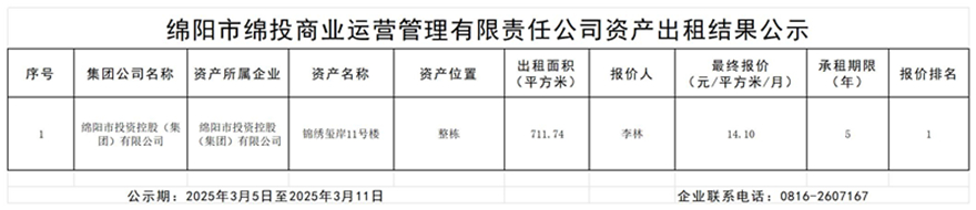 綿陽(yáng)市綿投商業(yè)運(yùn)營(yíng)管理有限責(zé)任公司資產(chǎn)出租結(jié)果公示