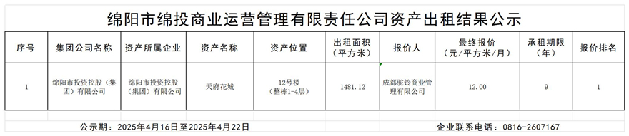 綿陽市綿投商業(yè)運營管理有限責任公司資產(chǎn)出租結果公示