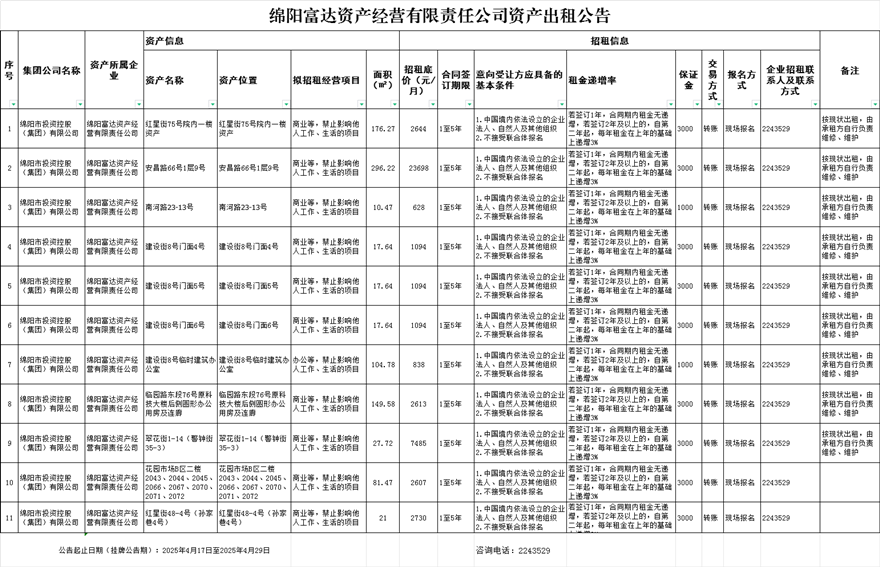 綿陽富達資產(chǎn)經(jīng)營有限責(zé)任公司資產(chǎn)出租公告