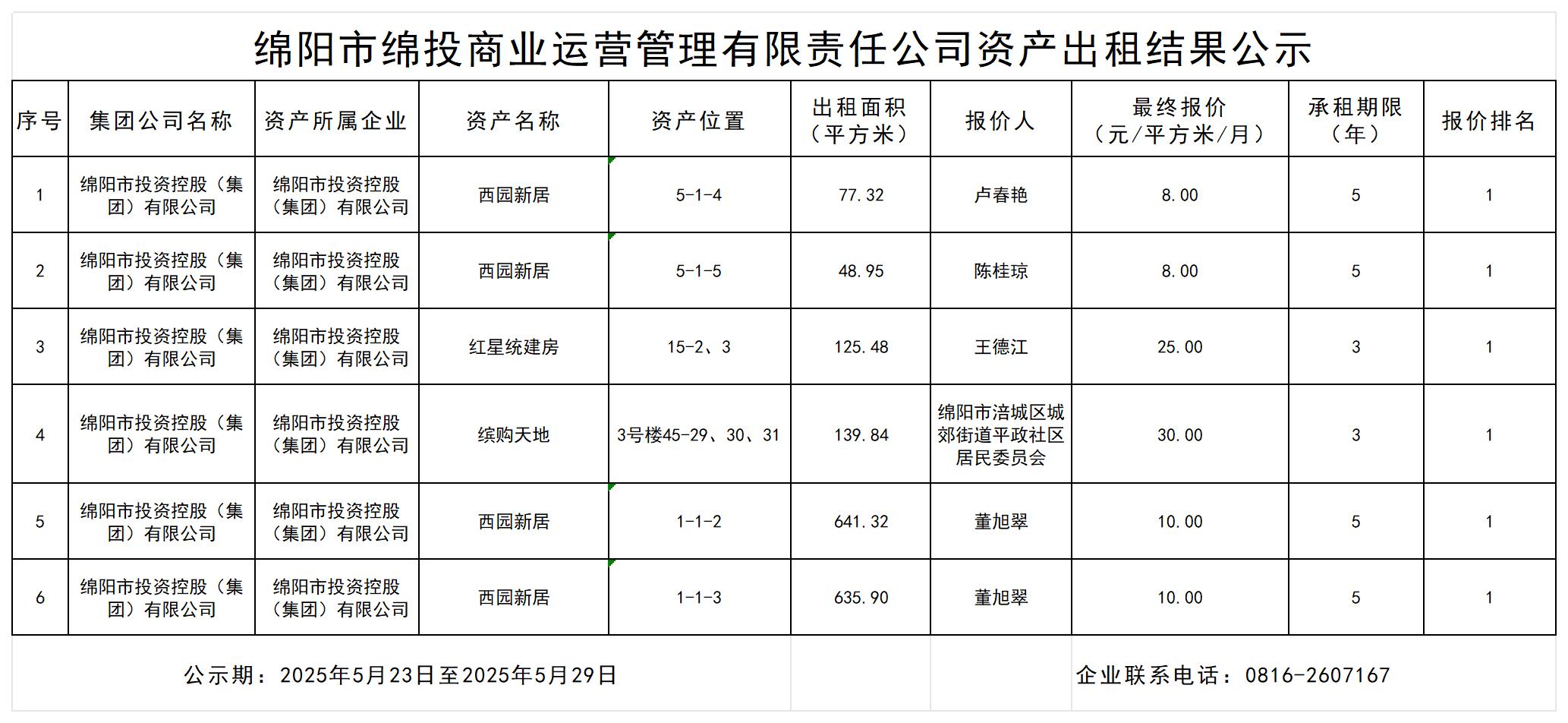 綿陽市綿投商業(yè)運營管理有限責任公司資產(chǎn)出租結(jié)果公示