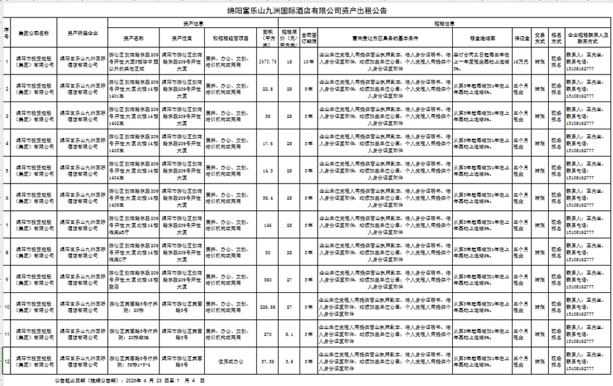 綿陽(yáng)富樂(lè)山九洲國(guó)際酒店有限公司資產(chǎn)出租公告