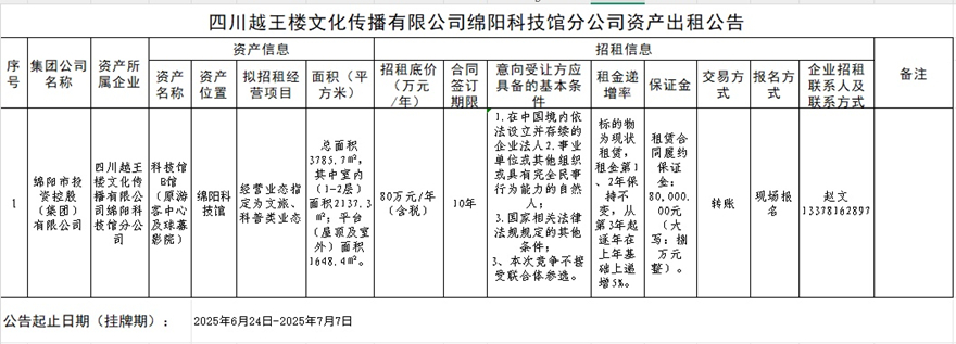 四川越王樓文化傳播有限公司綿陽科技館分公司資產(chǎn)出租公告