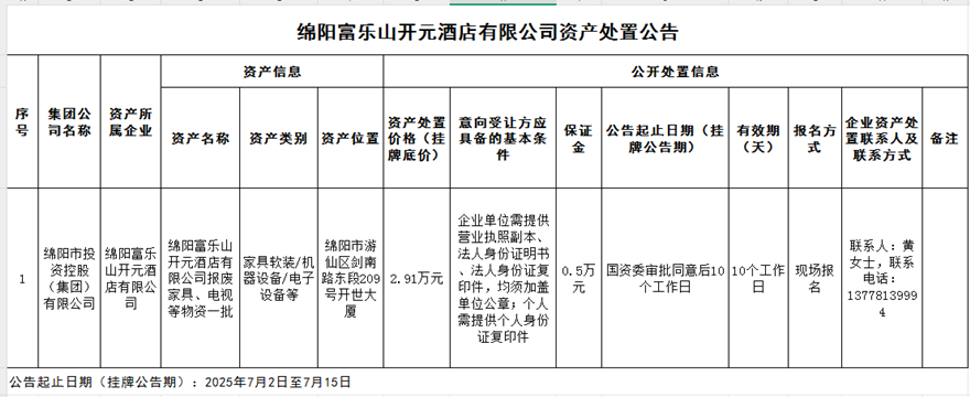 綿陽富樂山開元酒店有限公司資產(chǎn)處置公告