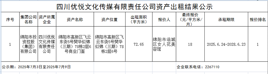 四川優(yōu)悅傳媒有限責任公司資產(chǎn)出租結(jié)果公示