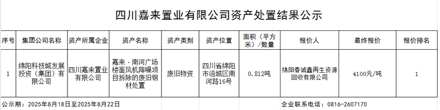 四川嘉來(lái)置業(yè)有限公司資產(chǎn)處置結(jié)果公示