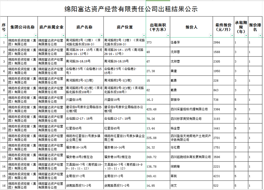 綿陽富達資產(chǎn)經(jīng)營有限責(zé)任公司出租結(jié)果公示