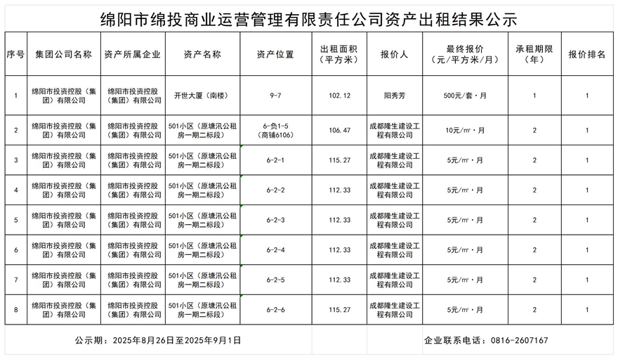 綿陽市綿投商業(yè)運營管理有限責(zé)任公司資產(chǎn)出租結(jié)果公示