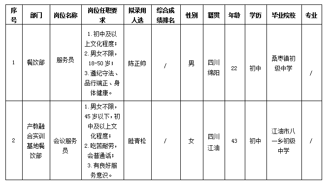 根據(jù)綿陽市綿州嘉來會(huì)務(wù)服務(wù)有限公司發(fā)布的招聘公告及招聘相關(guān)規(guī)定,經(jīng)面試、體檢等程序,擬錄用陳正帥、眭青松同志到餐飲部、產(chǎn)教融合實(shí)訓(xùn)基地餐飲部工作,現(xiàn)予以公示,具體情況如下: