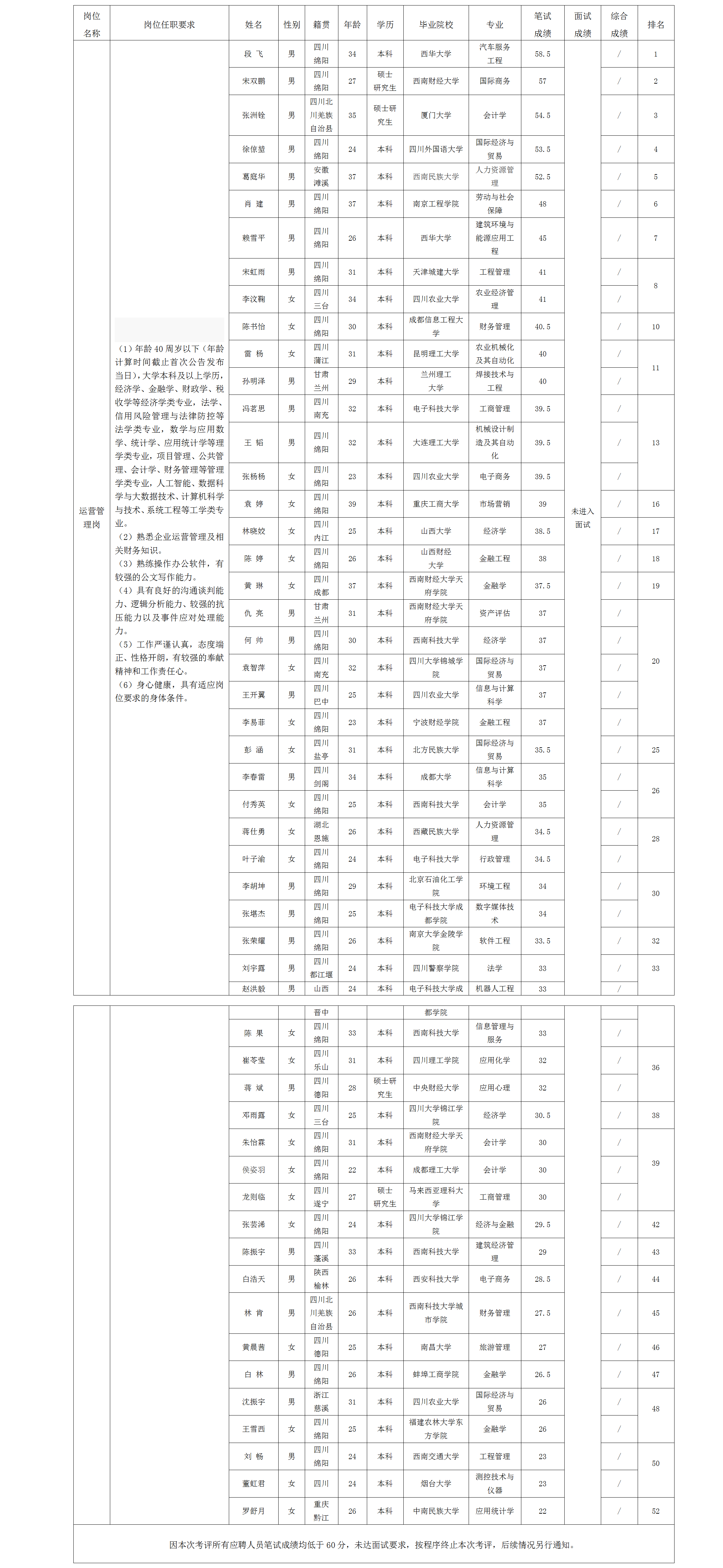 根據(jù)綿陽市投資控股(集團)有限公司發(fā)布的招聘公告及招聘相關(guān)規(guī)定,經(jīng)筆試、面試等程序,現(xiàn)將筆試(面試)成績予以公示。