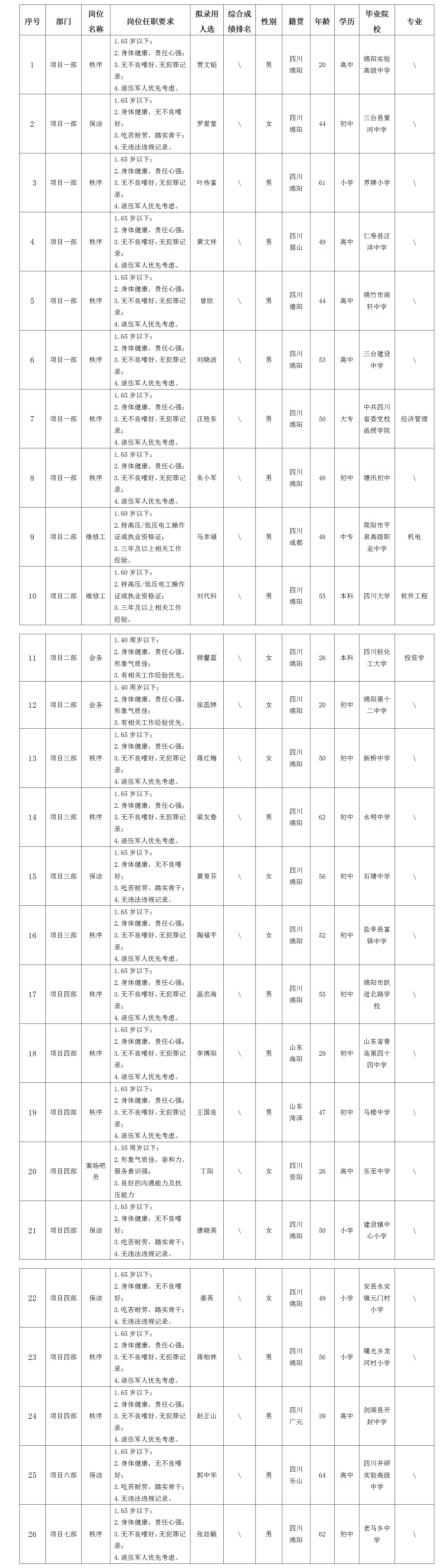 根據(jù)綿陽市康來物業(yè)服務(wù)有限公司發(fā)布的招聘公告及招聘相關(guān)規(guī)定,經(jīng)面試等程序,擬錄用賈文韜等同志到各項目部工作,現(xiàn)予以公示,具體情況如下: