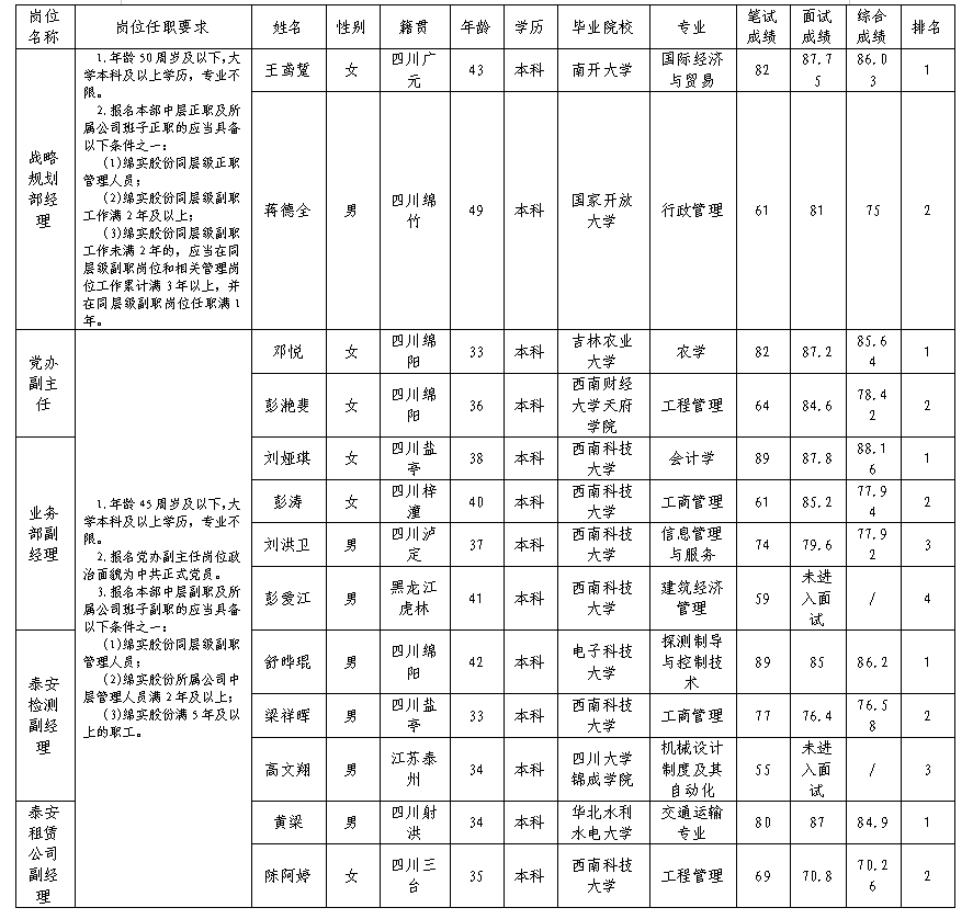 【內(nèi)部競(jìng)聘】綿陽(yáng)市汽車實(shí)驗(yàn)駕駛技術(shù)學(xué)校股份有限公司 關(guān)于戰(zhàn)略規(guī)劃部經(jīng)理等崗位內(nèi)部競(jìng)聘測(cè)試成績(jī)的公示