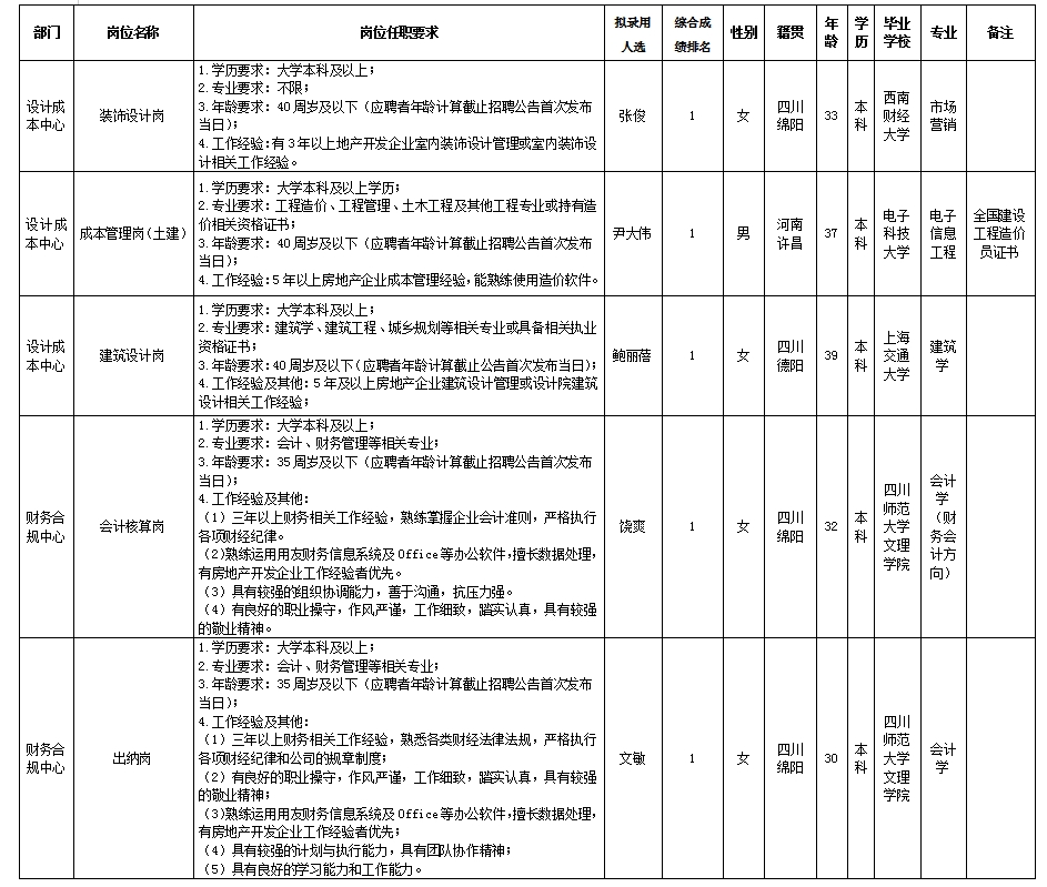 根據(jù)綿陽市綿投置地有限公司發(fā)布的招聘公告及招聘相關規(guī)定,經(jīng)筆試、面試、考察、體檢等程序,擬錄用張俊等5名同志到綿陽市綿投置地有限公司工作,現(xiàn)予以公示,具體情況如下: