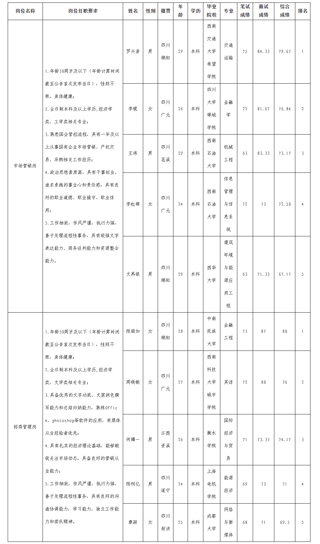 根據(jù)綿陽市綿投商業(yè)運(yùn)營(yíng)管理有限責(zé)任公司發(fā)布的招聘公告及招聘相關(guān)規(guī)定,經(jīng)筆試、面試等程序,現(xiàn)將筆試、面試成績(jī)予以公示。