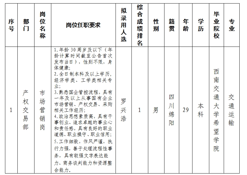 根據(jù)綿陽市綿投商業(yè)運營管理有限責任公司發(fā)布的招聘公告及招聘相關規(guī)定,經(jīng)筆試、面試、考察、體檢等程序,擬錄用羅興浩同志到產(chǎn)權交易部工作,現(xiàn)予以公示,具體情況如下:
