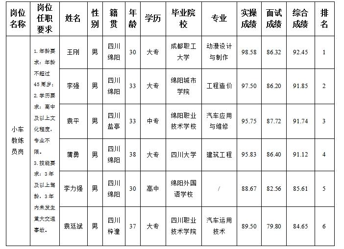 根據(jù)綿陽市汽車實驗駕駛技術學校股份有限公司發(fā)布的招聘公告及招聘相關規(guī)定,經(jīng)面試、實操等程序,現(xiàn)將面試、實操成績予以公示。