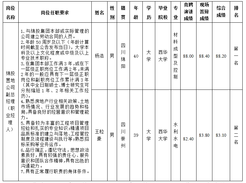 根據綿投集團《關于開展綿投置地公司經理層副職(職業(yè)經理人)內部選聘的公告》(綿投控司發(fā)〔2025〕119號)及招聘相關規(guī)定,經競聘演講、現場答辯等程序,現將競聘成績予以公示。