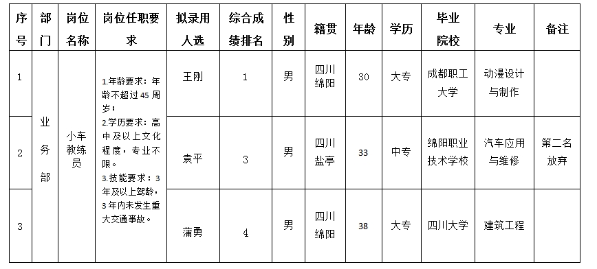 根據(jù)綿陽市汽車實驗駕駛技術(shù)學(xué)校股份有限公司發(fā)布的招聘公告及招聘相關(guān)規(guī)定,經(jīng)實操、面試、考察、體檢等程序,擬錄用王剛等3位同志到綿陽市汽車實驗駕駛技術(shù)學(xué)校股份有限公司工作,現(xiàn)予以公示,具體情況如下: