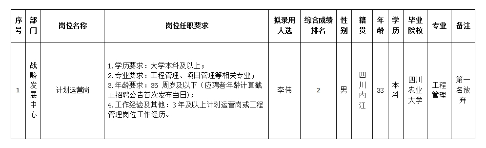 根據(jù)綿陽市綿投置地有限公司發(fā)布的招聘公告及招聘相關(guān)規(guī)定,經(jīng)筆試、面試、考察、體檢等程序,擬錄用李偉同志到綿陽市綿投置地有限公司工作,現(xiàn)予以公示,具體情況如下: