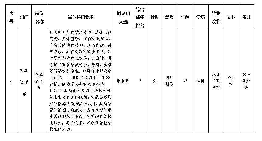 根據(jù)綿陽市嘉遠瑞華房地產(chǎn)開發(fā)有限公司發(fā)布的招聘公告及招聘相關(guān)規(guī)定,經(jīng)筆試、面試、考察、體檢等程序,擬錄用曹彥芹同志到核算會計崗工作,現(xiàn)予以公示,具體情況如下: