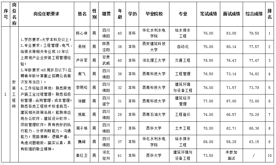 根據(jù)綿陽市綿投置地有限公司發(fā)布的招聘公告及招聘相關規(guī)定,經(jīng)筆試、面試等程序,現(xiàn)將筆試、面試成績予以公示。