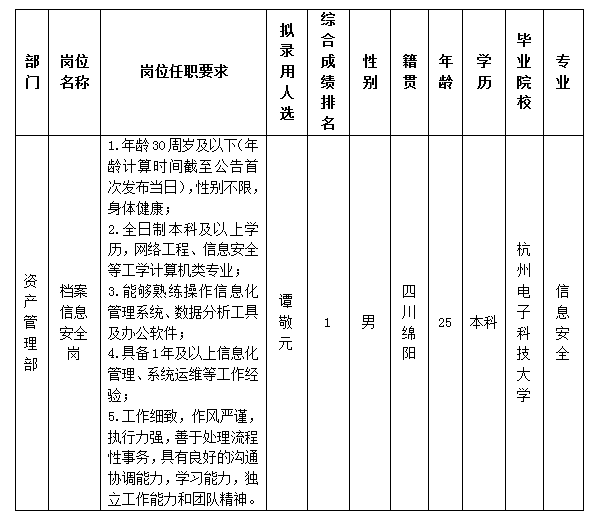 根據(jù)綿陽市綿投商業(yè)運營管理有限責任公司發(fā)布的招聘公告及招聘相關規(guī)定,經(jīng)筆試、面試、背景調查、體檢等程序,擬錄用譚敬元同志到綿陽市綿投商業(yè)運營管理有限責任公司工作,現(xiàn)予以公示,具體情況如下: