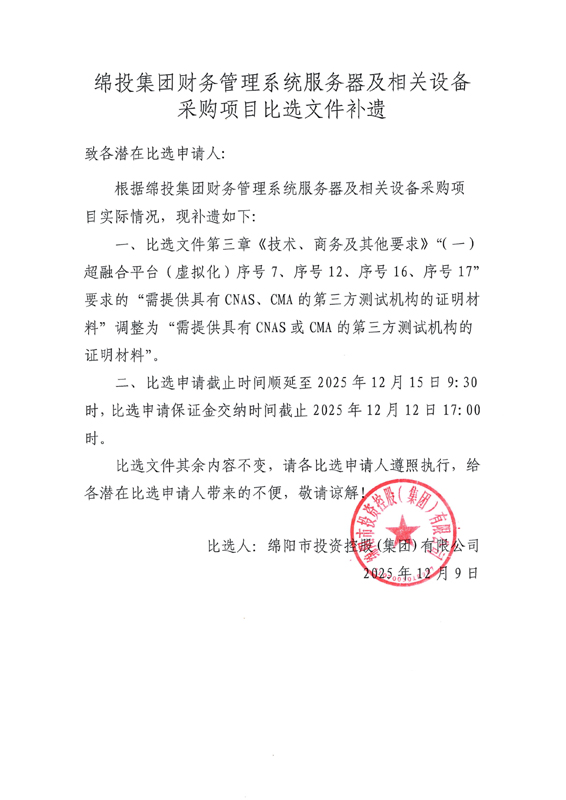 綿投集團財務管理系統(tǒng)服務器及相關(guān)設備采購項目比選文件補遺