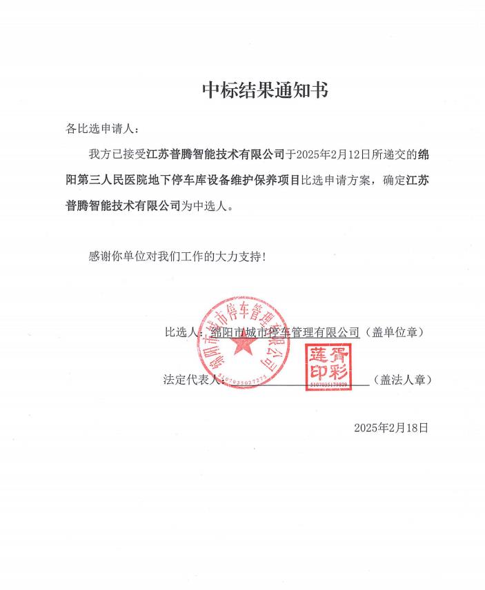 綿陽第三人民醫(yī)院地下停車庫設備維護保養(yǎng)項目中標結果通知書