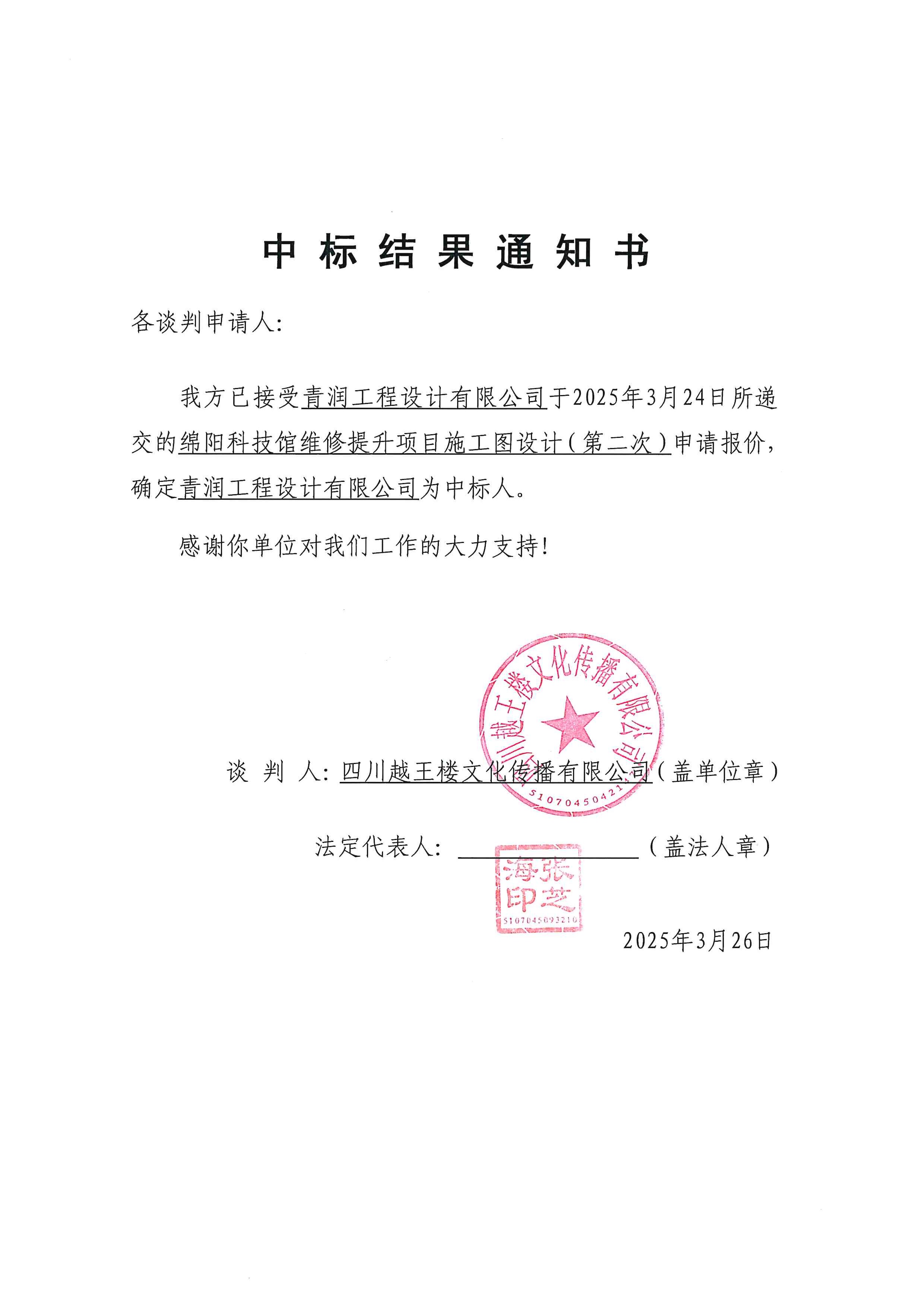 綿陽科技館維修提升項目施工圖設計(第二次)競爭性談判結(jié)果公告