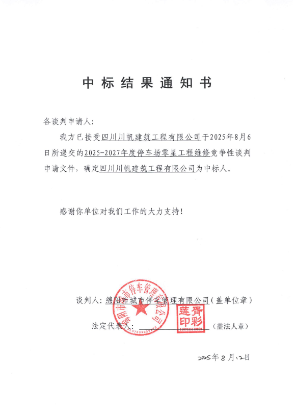 2025-2027年度停車場零星工程維修項目中標(biāo)結(jié)果通知