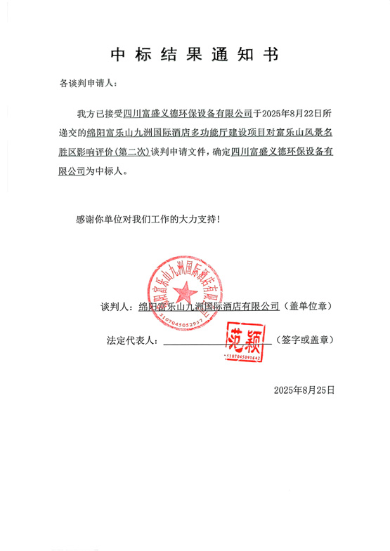 綿陽(yáng)富樂山九洲國(guó)際酒店多功能廳建設(shè)項(xiàng)目對(duì)富樂山風(fēng)景名勝區(qū)影響評(píng)價(jià)(第二次)中標(biāo)結(jié)果通知