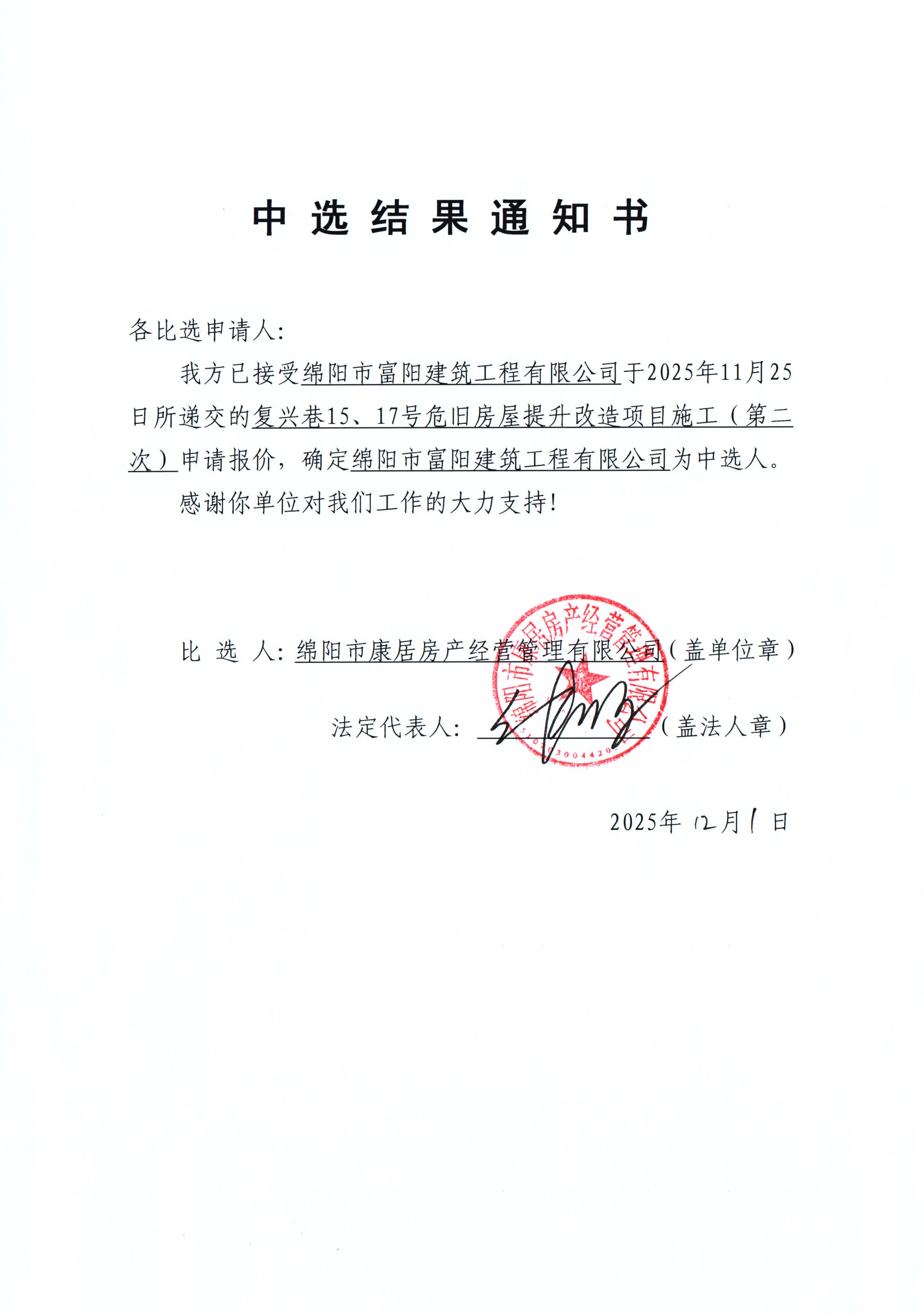 復(fù)興巷15、17號(hào)危舊房屋提升改造項(xiàng)目施工(第二次)中選結(jié)果通知