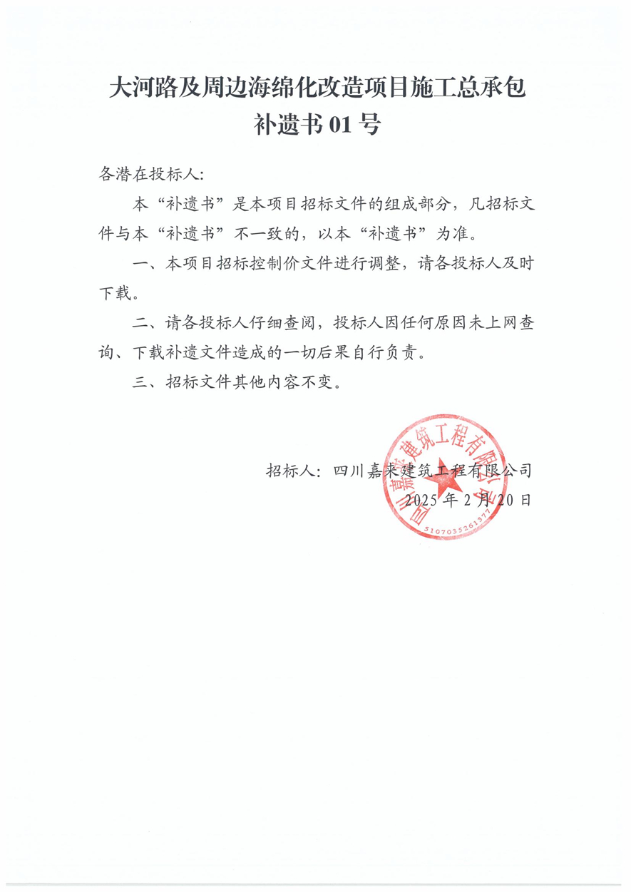 大河路及周邊海綿化改造項目施工總承包補遺書01號