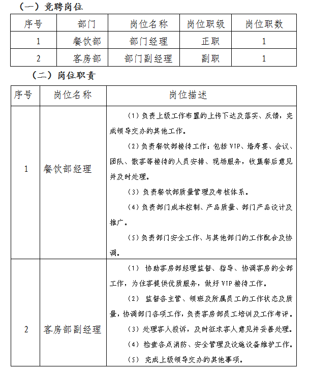 2.教育背景:銷售代表應具有中專及以上文化程度,有酒店營銷經(jīng)驗優(yōu)先;前廳部款接應具有高中及以上學歷,有一年以上酒店、前臺相關工作經(jīng)驗者優(yōu)先;其他崗位初中及以上文化程度。