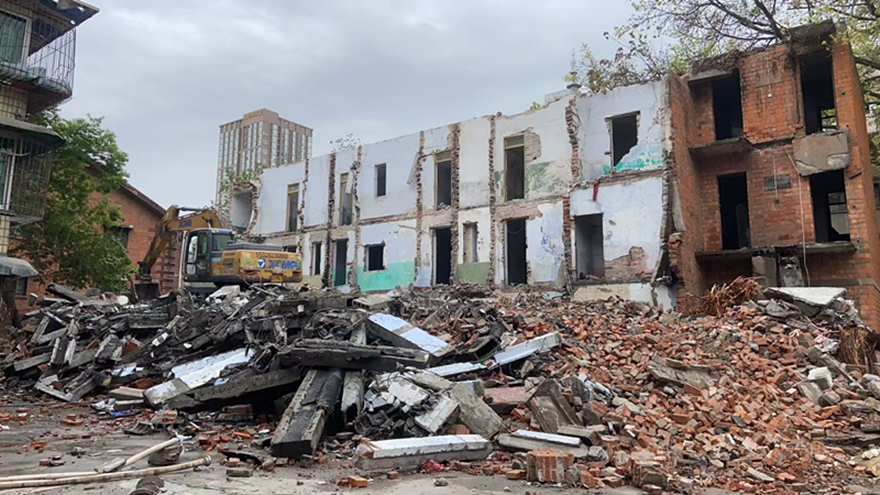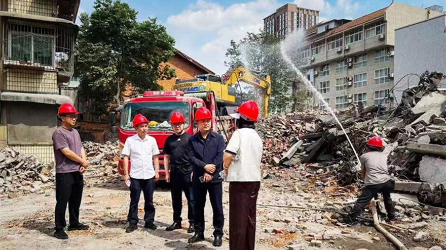 危房緊鄰周邊住宅,施工空間狹小,拆除難度極大。為確保拆除工作安全有序進行,富達公司多次組織建筑、安全專家現(xiàn)場勘查,研究制定了“機械拆除為主,人工配合為輔”的精細化拆除方案。拆除現(xiàn)場,工作人員設(shè)置警戒線封鎖拆除區(qū)域,專人疏導(dǎo)圍觀群眾,維護現(xiàn)場秩序。伴隨著挖掘機的轟鳴聲,危房樓體結(jié)構(gòu)在專業(yè)人員的精準(zhǔn)操控下逐步瓦解,同步實施灑水降塵措施,整個拆除過程安全、有序、環(huán)保。