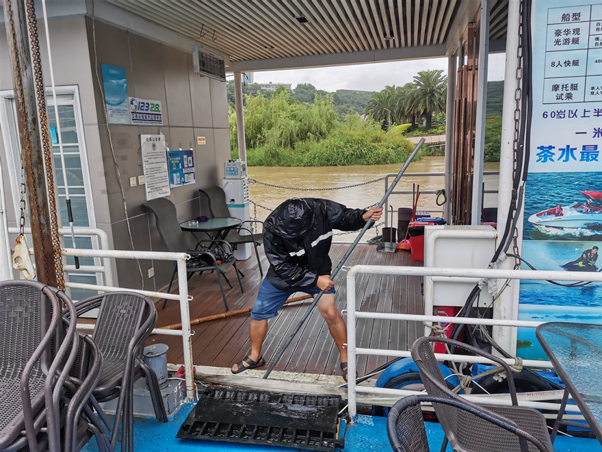 8月17日下午,隨著綿陽市氣象臺發(fā)布暴雨藍色預警,三江碼頭再次遭遇較強降雨考驗。越王樓公司根據實時雨情、水情變化,迅速將夜班巡查崗增設至兩人,加強巡查力度,時時掌握碼頭重點部位、關鍵設施設備、商家、各型船只情況,實時通報汛情,做到巡查檢查無盲區(qū),信息交流無障礙。至18日凌晨,涪江瞬時流量達到3000m3/秒,越王樓公司立即啟動防汛專項應急預案,公司領導第一時間到達現場,警戒組、搶險組迅速設置禁行標識,布設隔離帶,封閉廊橋,放倒廊橋欄桿。同時通知商家做好應汛準備,安排專人登上游船、餐飲躉船,檢查纜繩系固及動桿情況,并沿途查看各關鍵節(jié)點位防汛工作落實情況。